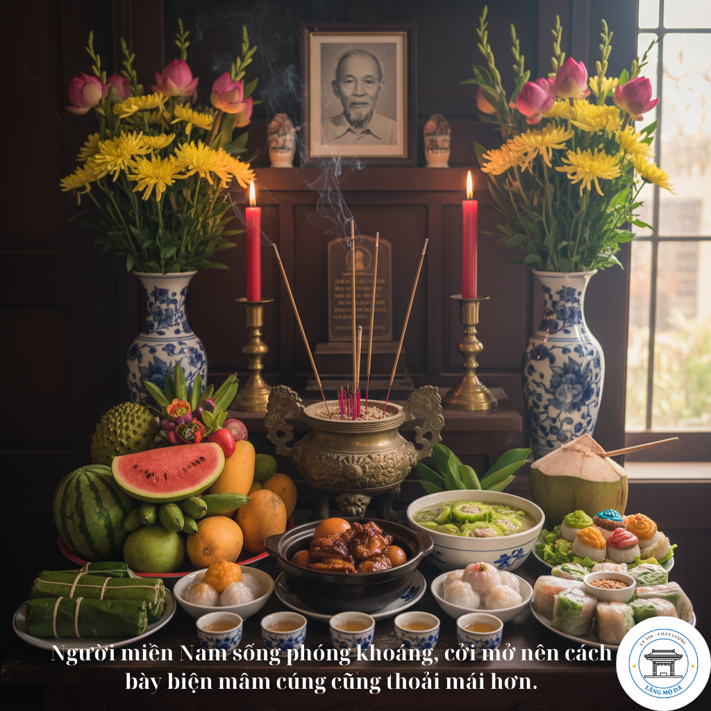 Người miền Nam sống phóng khoáng, cởi mở nên cách bày biện mâm cúng cũng thoải mái hơn. Tuy không cầu kỳ như miền Bắc, nhưng mâm cúng miền Nam lại chú trọng sự sung túc và nhiều màu sắc.