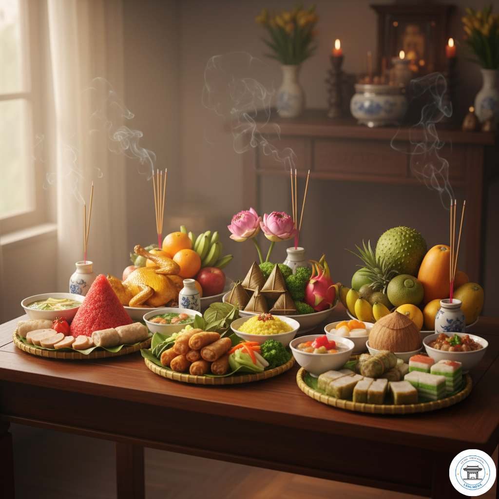 - Lễ chay: Trái cây theo mùa, chè, bánh ngọt.