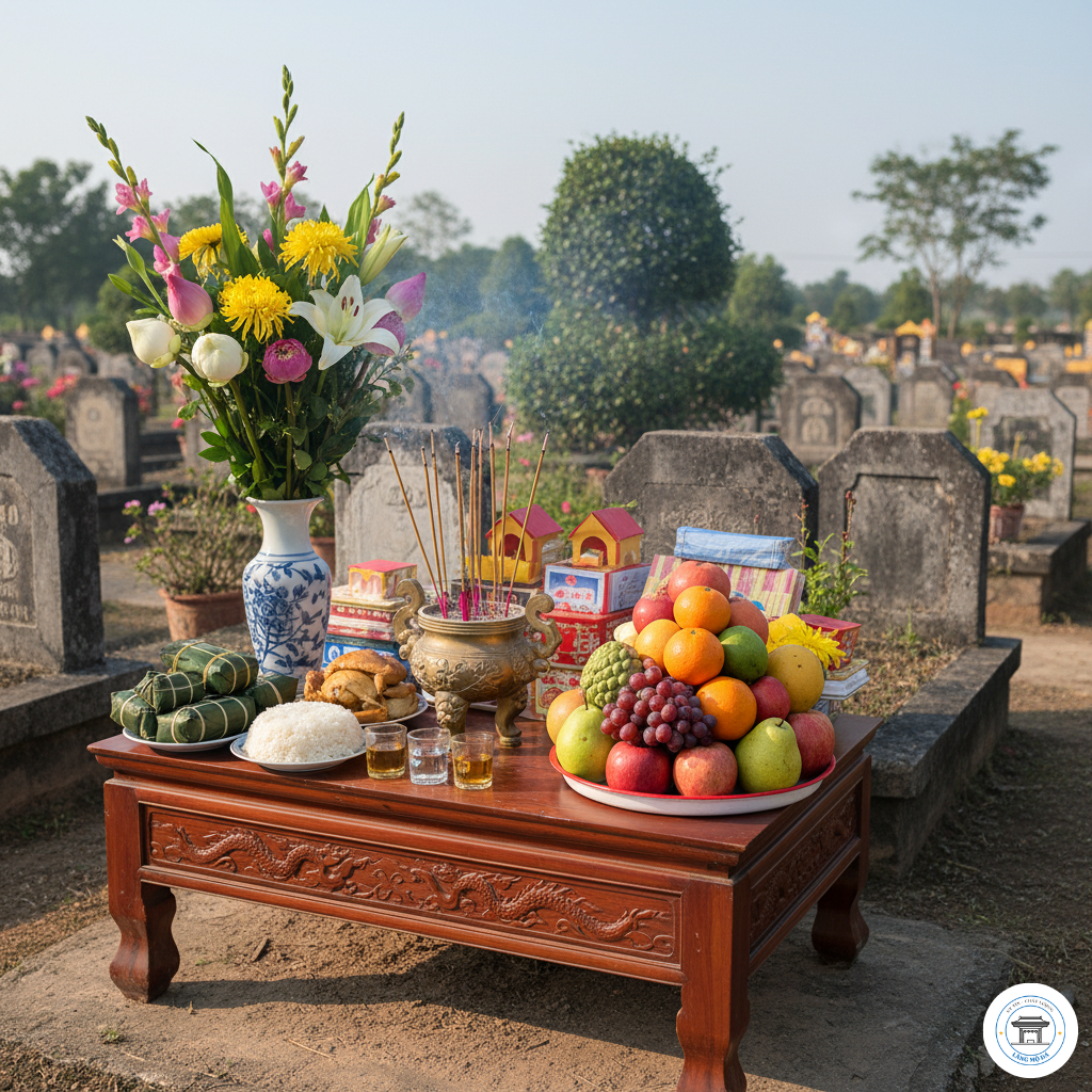 - Mâm cúng: đơn giản, có hương, hoa, nước, rượu, mâm cơm 3–5 món.