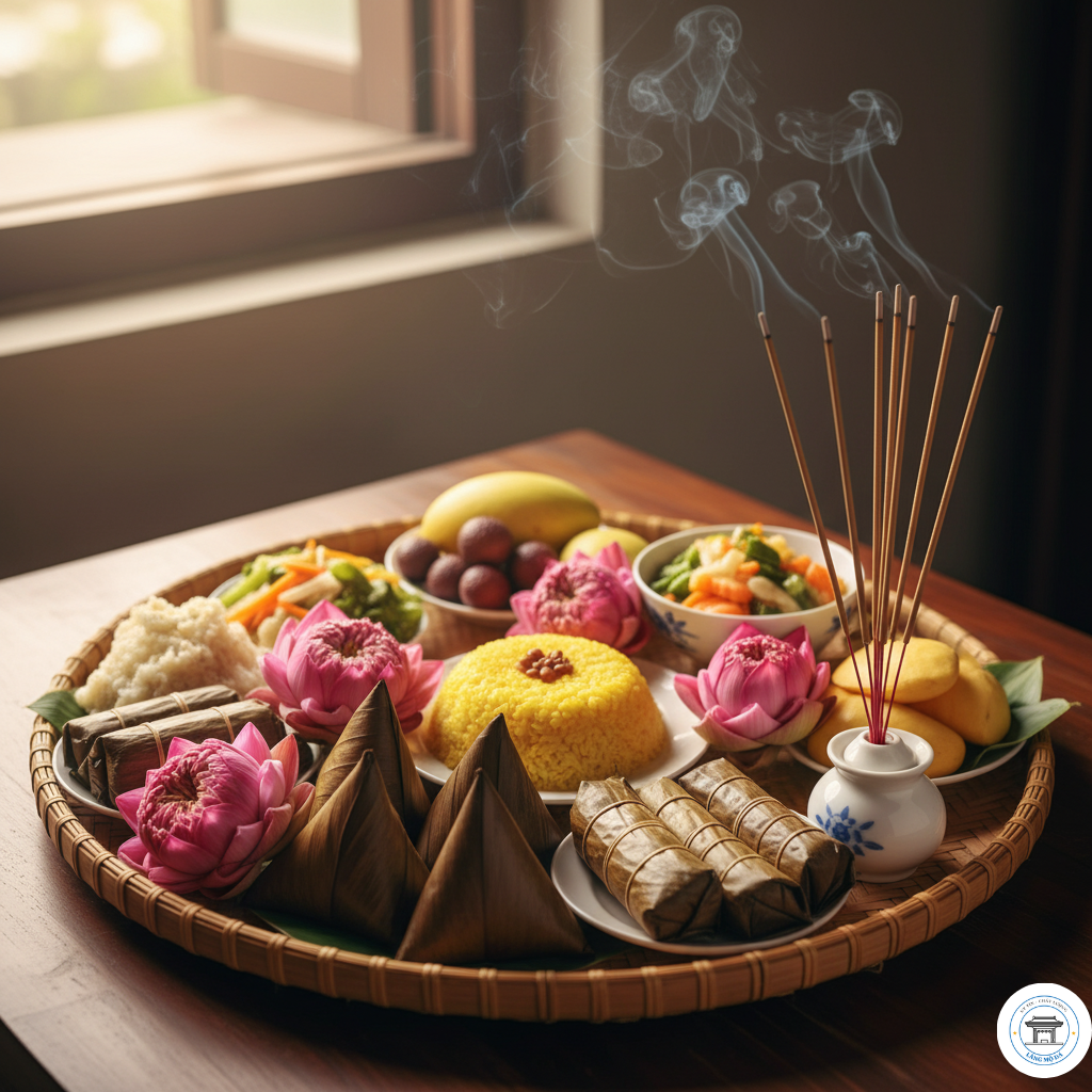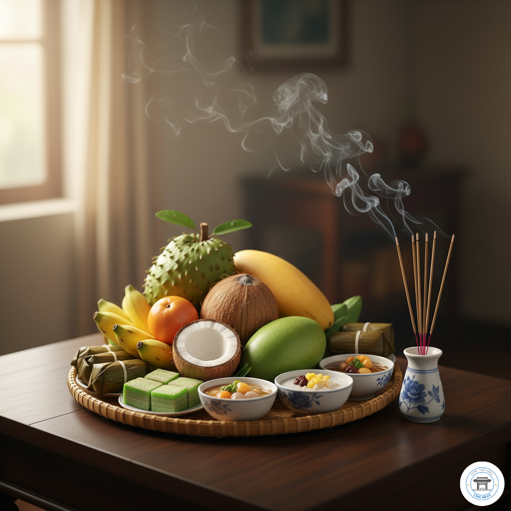 • Lễ vật: hương hoa, trầu cau, bánh trái, mâm cơm chay hoặc mặn.