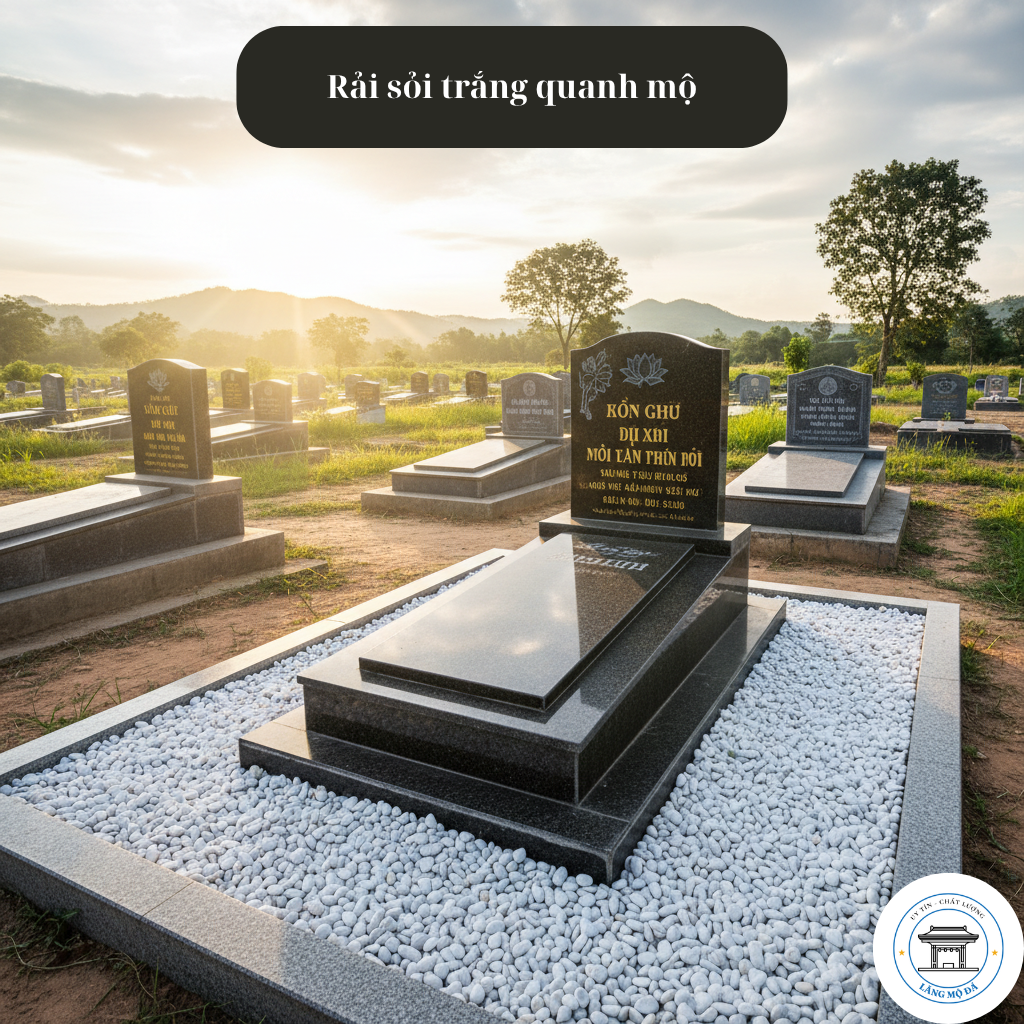 Sỏi trắng giúp chống cỏ mọc, thoát nước nhanh và tạo vẻ trang nhã. Có thể chọn loại sỏi tròn hoặc sỏi ngọc nhỏ, trải đều quanh chân mộ.